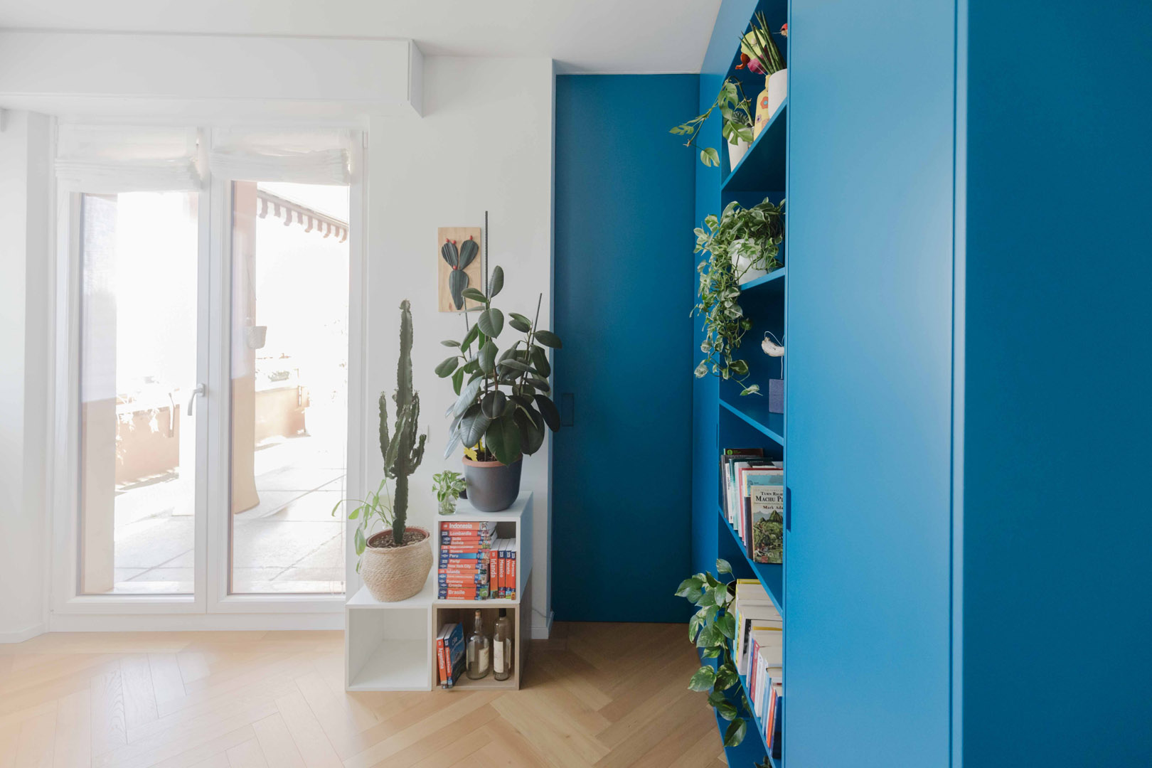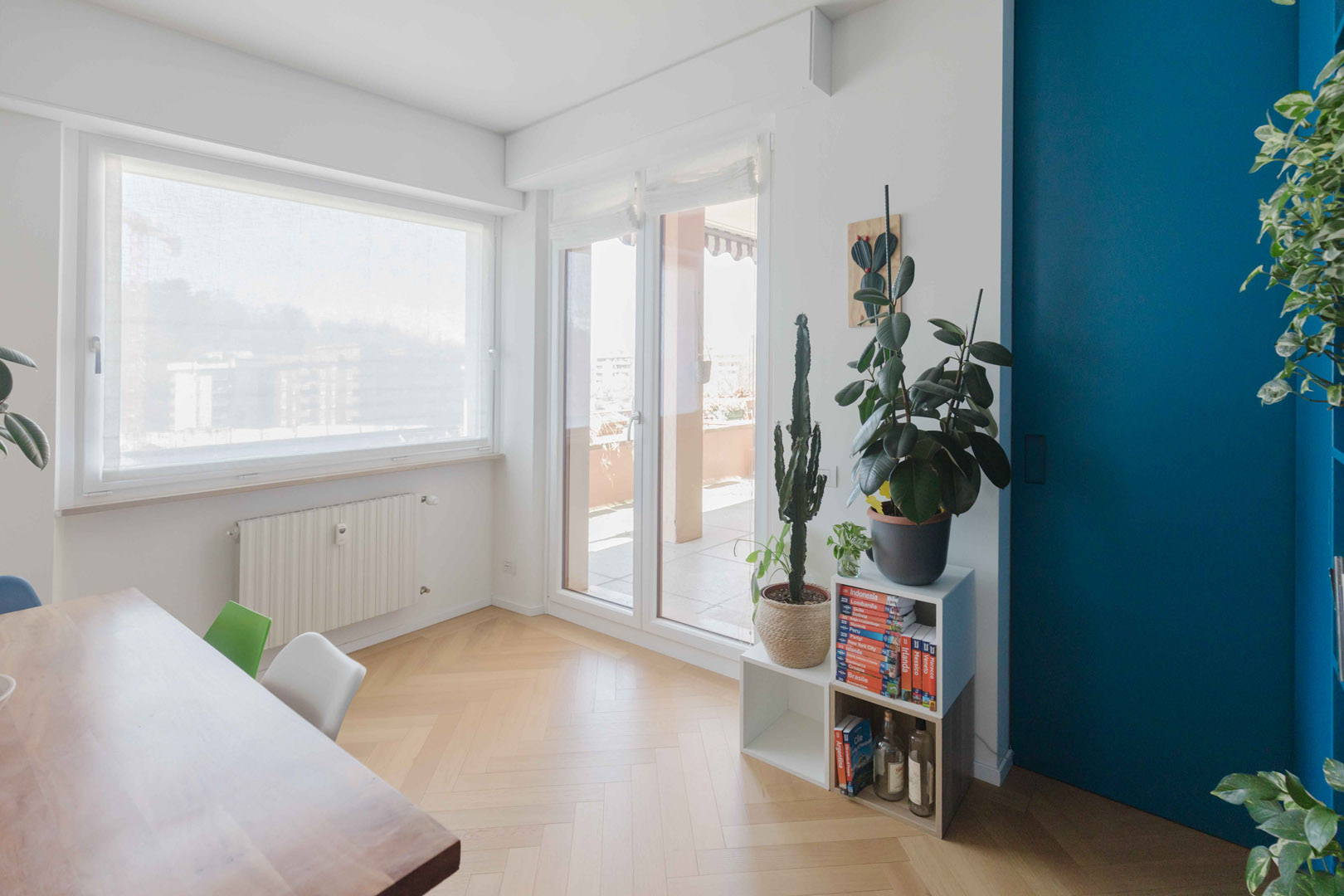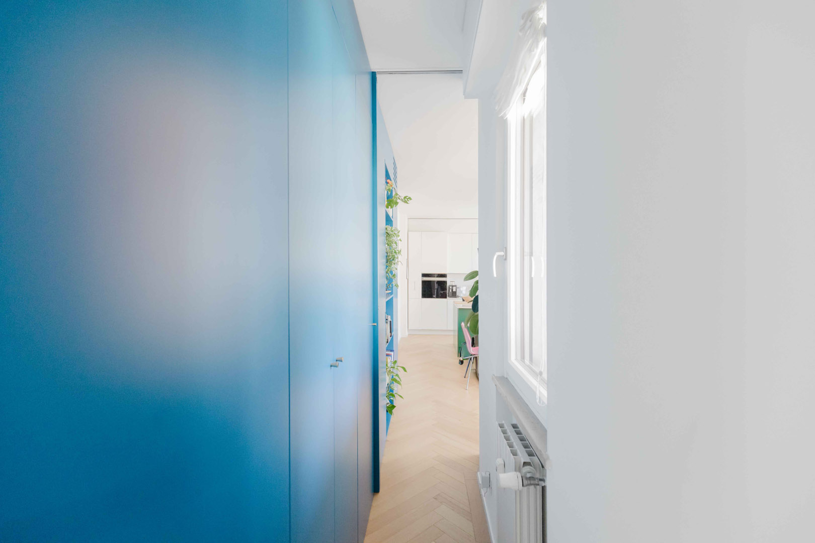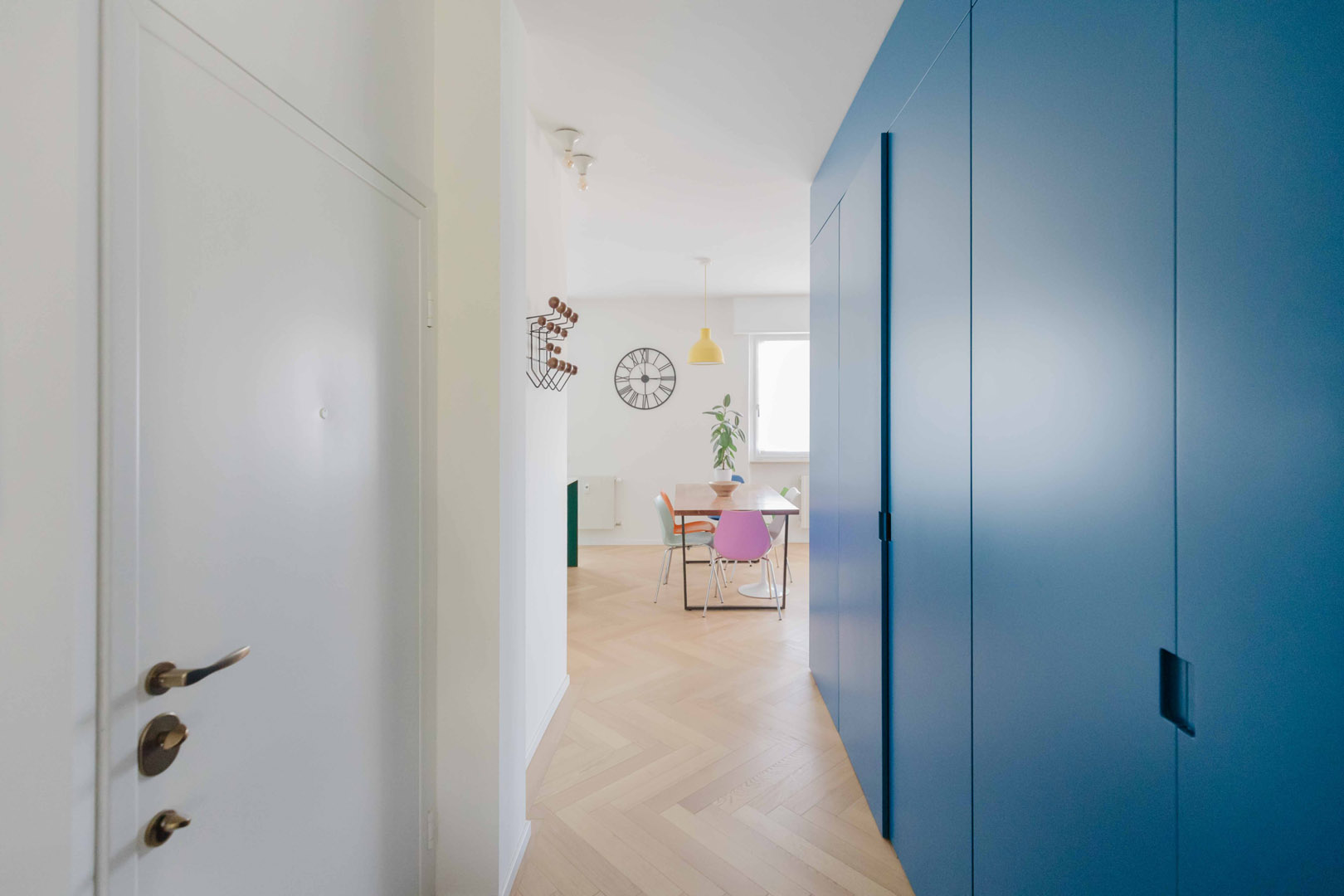 - Ingresso con un elegante armadio di colore blu, che nasconde l’accesso a un primo bagno/lavanderia e funge da porta-cappotti;