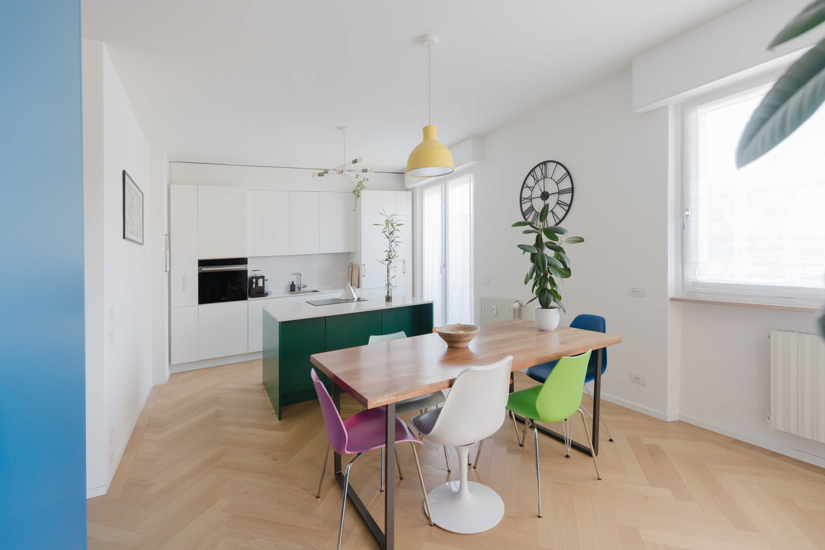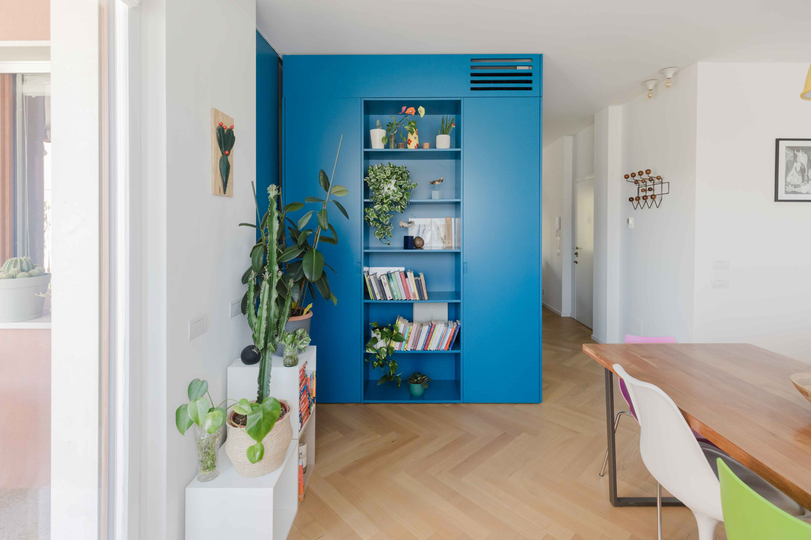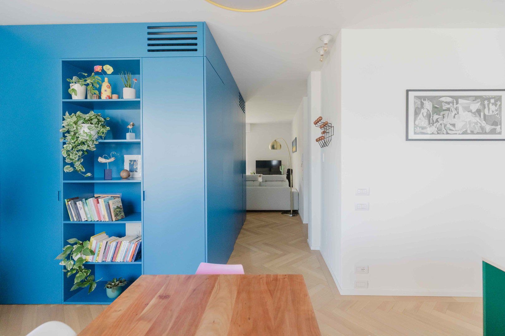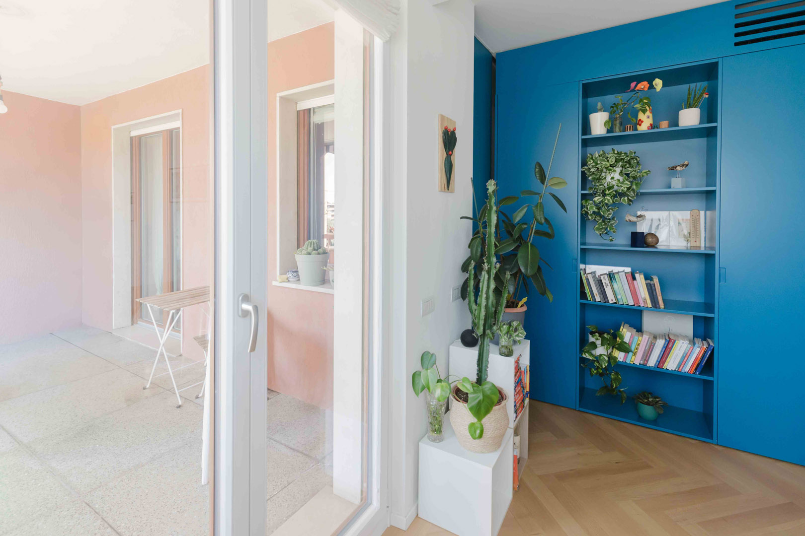 - Ingresso con un elegante armadio di colore blu, che nasconde l’accesso a un primo bagno/lavanderia e funge da porta-cappotti;
