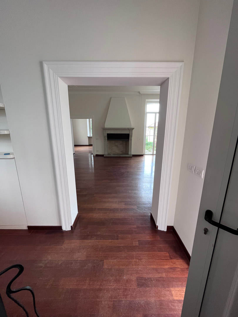 L’immobile, di circa 325 mq, si sviluppa su due piani fuori terra, una mansarda e un piano semi-interrato. L’accesso avviene tramite un cortile condiviso con altre proprietà, dove sono situati i box auto: la villa dispone di due posti auto coperti.